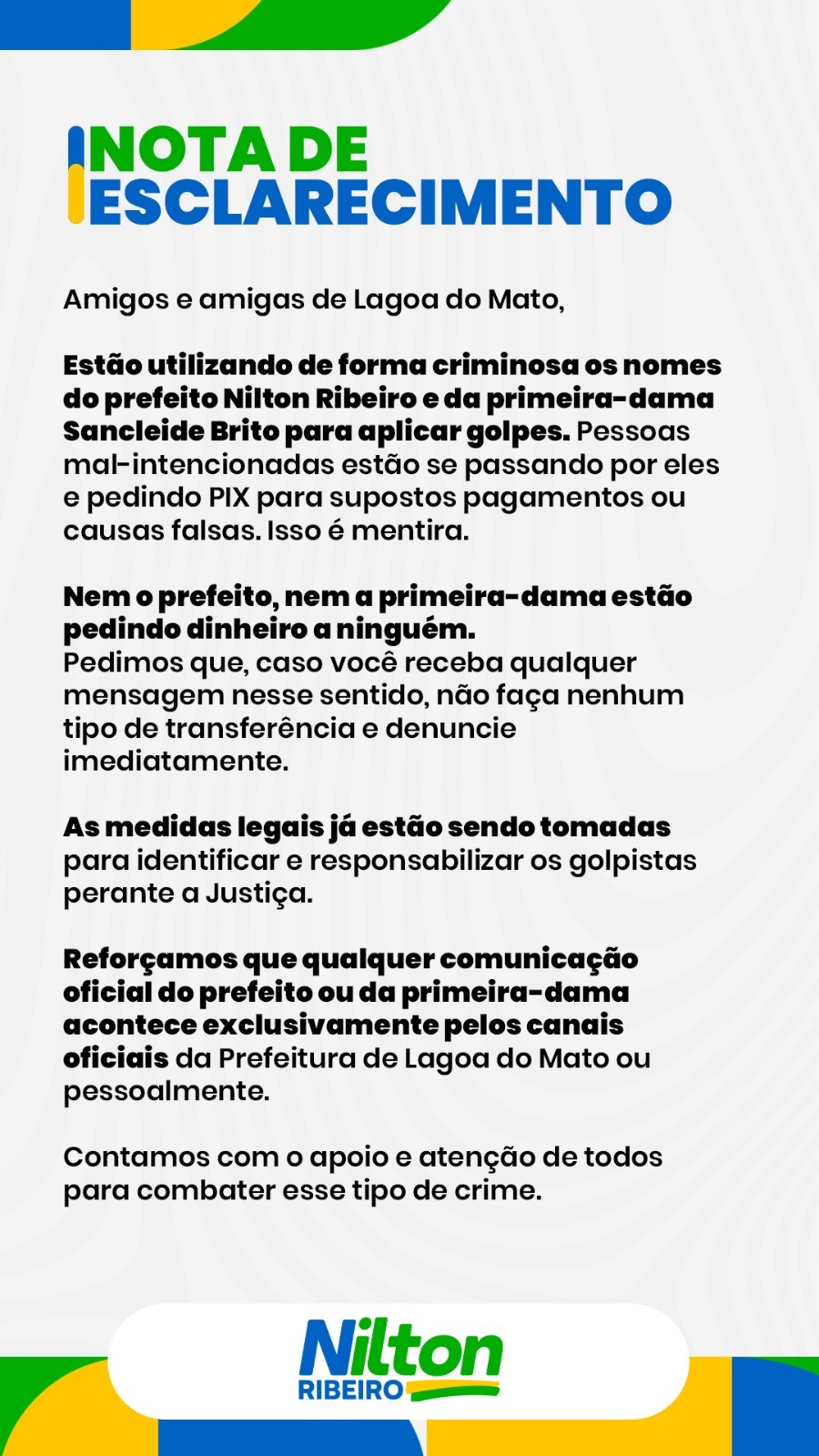 A Prefeitura de Lagoa do Mato emitiu uma nota de esclarecimento para alertar a população sobre golpes que estão sendo aplicados utilizando de forma criminosa os nomes do prefeito Nilton